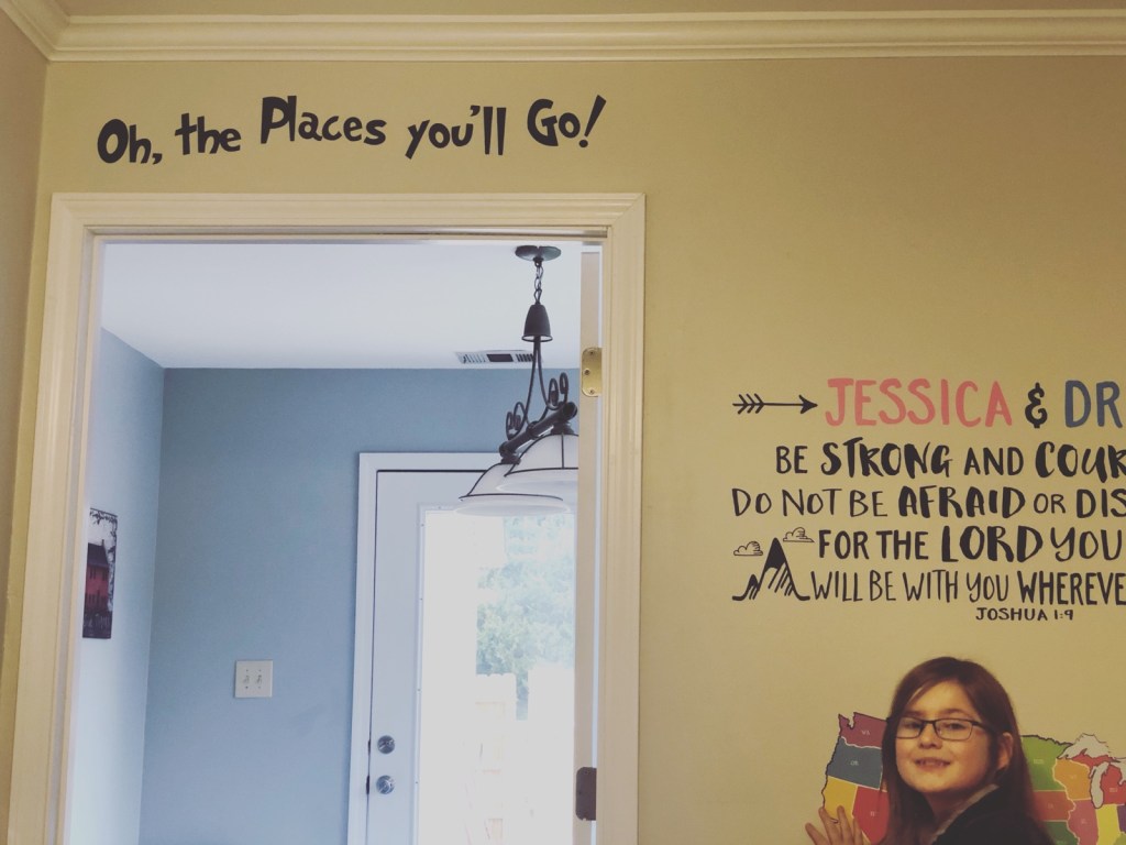 Later on, I added this decal above the door. Oh, the Places You’ll Go kind of tied into my theme of traveling the world.