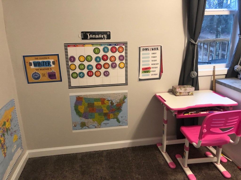 I tried to make use of every space in that room since it was a small room. Instead of a whiteboard, I just bought a dry erase decal to stick on the wall at sitting level. Now, my 7 year old practices her spelling words and my 3 year old practices letters. It worked out so much better than I pictured!